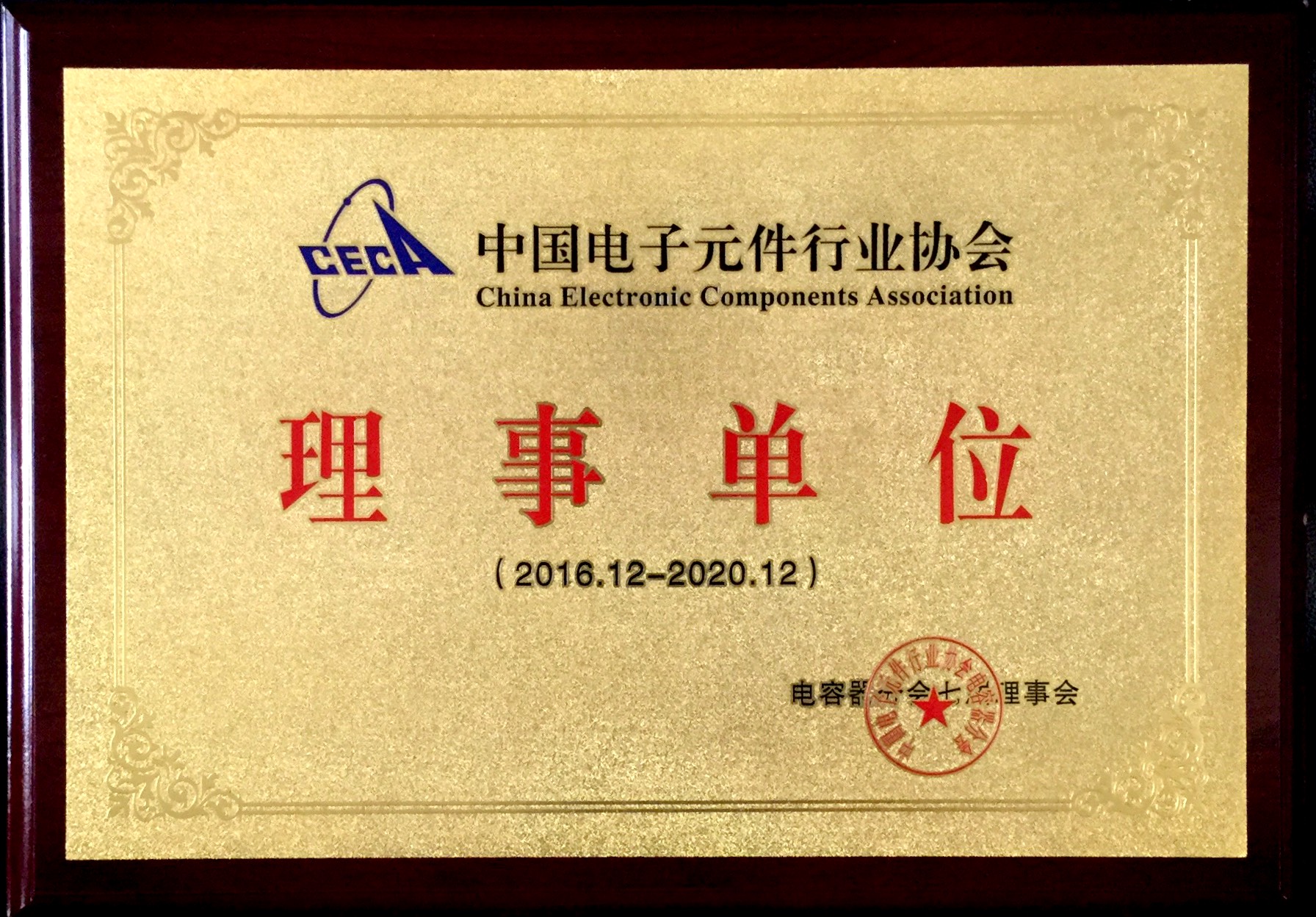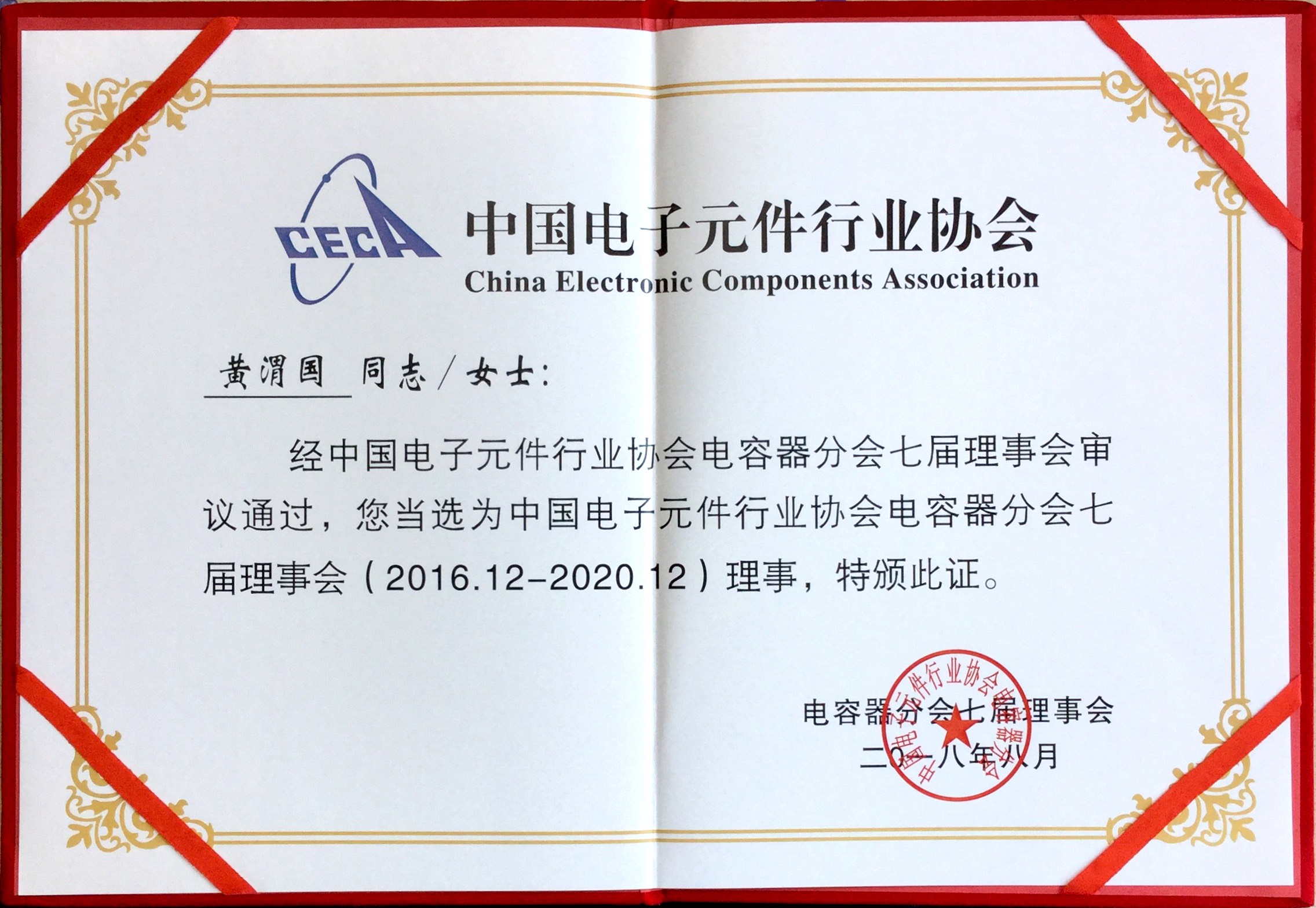 2018年9月,我司被评为中国电子元件行业协会电容器分会理事单位,我司总司理黄渭国先生中选为中国电子元件行业协会电容器分会理事 。
